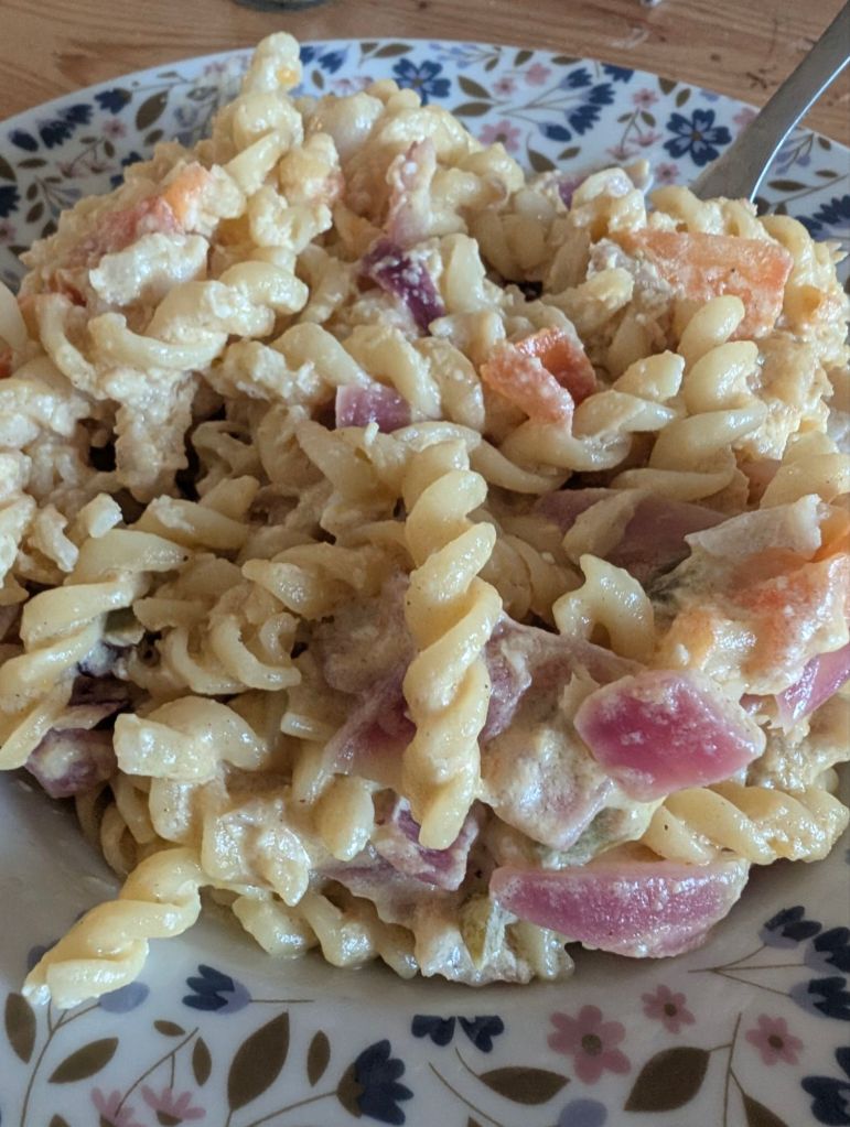 Pour mon repas du soir du 6 avril, je me suis concocté une salade de pâtes chaude avec les restes de légumes de la veille accompagnée de Colin d’Alaska. Pour cette recette, totalement improvisée, j’ai d’abord mis un filet d’huile d’olive et commencé la cuisson de mon poisson, dans une casserole. J’ai mis de la crème fraîche épaisse 30 %, le reste d’oignon rouge, de tomates et de poivrons. Je l’ai assaisonné de sel et de poivre, étant donné que j’étais légèrement trop généreux sur le sel, j’ai mis une cuillère à café de sucre en poudre pour rehausser les saveurs. Ensuite, j’ai mis quelques gouttes de Tabasco avec un trait de jus de citron.