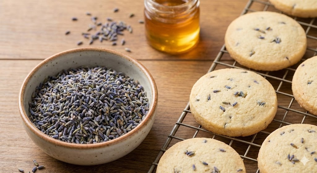 Enfin, voici un exemple d’utilisation correcte. On voit bien dans le bol les petites fleurs séchées de Lavande Vraie, prêtes à être incorporées dans la pâte ou saupoudrées sur les biscuits après cuisson. L’association avec le miel est un classique indémodable.